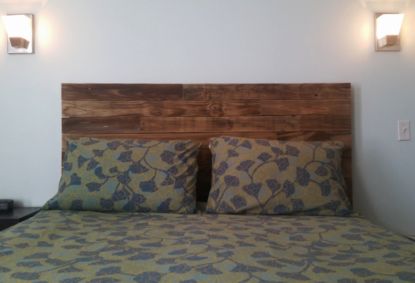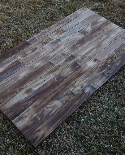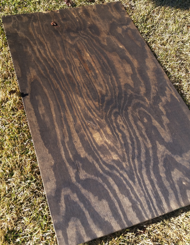 Next, we cut a piece of plywood a few inches smaller than the dimensions we wanted for the headboard and stained it so the lighter wood would not show through any of the seams.